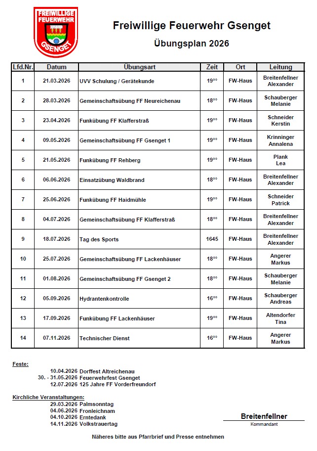 Übungsplan der FFW Gsenget 2026